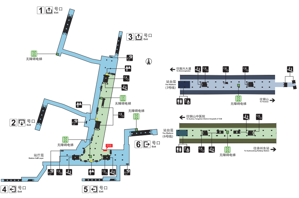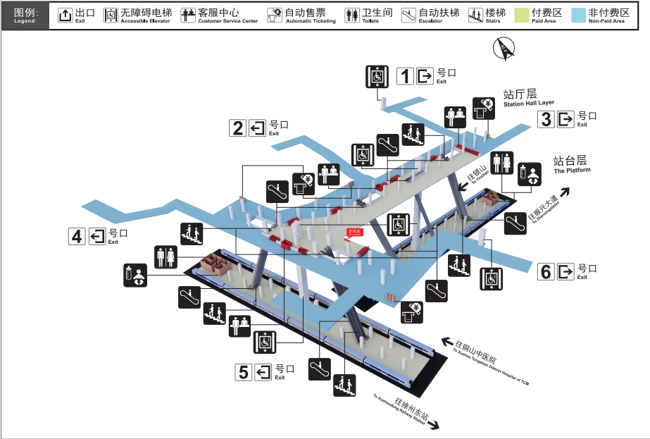 自动扶梯:站厅层南北两侧、中部,各出入口